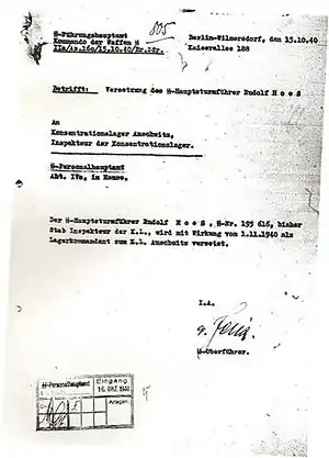 In June 1941, according to Höss's trial testimony, he was summoned to Berlin for a meeting with Himmler "to receive personal orders".[27] Himmler told Höss that Hitler had given the order for the "Final solution". According to Höss, Himmler had selected Auschwitz for the extermination of Europe's Jews "on account of its easy access by rail and also because the extensive site offered space for measures ensuring isolation". Himmler described the project as a "secret Reich matter" and told Höss not to speak about it with SS-Gruppenführer Richard Glücks, head of the Nazi camp system run by the Death's Head Unit.[27] Höss said that "no one was allowed to speak about these matters with any person and that everyone promised upon his life to keep the utmost secrecy". He told his wife about the camp's purpose only at the end of 1942, since she already knew about it from Fritz Bracht. Himmler told Höss that he would be receiving all operational orders from Adolf Eichmann, who arrived at the camp four weeks later.[27]