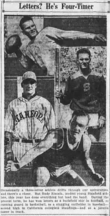 Rintala also starred as a center fielder for the Stanford baseball team, batting cleanup[5] and serving as team captain in 1932.[6] He also was a starting guard for the Stanford basketball team,[7] and threw javelin for the school's varsity track and field squad.[8]