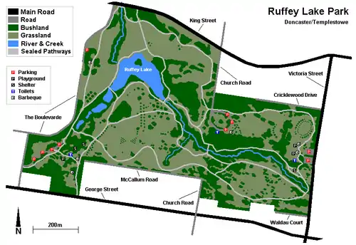 The park has three toilet blocks and electric barbecues are distributed throughout. There are three playgrounds in Ruffey Lake Park; near the Boulevard and Victoria St entrances. In the last 10 years facilities have been upgraded, predominantly the playgrounds, especially the Victoria Street adventure playground. There are sealed pathways giving access to almost every area of the park. These are of standard width and in relatively good condition but do not host dividing lines. The north-west area of the park has fewer facilities.[3]