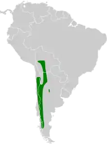 It is found in Argentina, Bolivia, and Chile. Its natural habitats are subtropical or tropical high-altitude shrubland and subtropical or tropical high-altitude grassland.