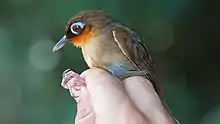 The rufous-throated antbird was described by the French polymath Georges-Louis Leclerc, Comte de Buffon in 1775 in his Histoire Naturelle des Oiseaux from a specimen collected in Cayenne, French Guiana.[2] The bird was also illustrated in a hand-coloured plate engraved by François-Nicolas Martinet in the Planches Enluminées D'Histoire Naturelle which was produced under the supervision of Edme-Louis Daubenton to accompany Buffon's text.[3] Neither the plate caption nor Buffon's description included a scientific name but in 1783 the Dutch naturalist Pieter Boddaert coined the binomial name Turdus rufigula in his catalogue of the Planches Enluminées.[4] The rufous-throated antbird is now placed in the genus Gymnopithys was introduced by the French ornithologist Charles Lucien Bonaparte in 1857 with the rufous-throated antbird as the type species.[5][6] The name Gymnopithys combines the Ancient Greek gumnos meaning "bare" or "naked" with the name of the antbird genus Pithys that was erected by the French ornithologist Louis Jean Pierre Vieillot in 1818. The specific epithet rufigula combines the Latin words rufus "red" and gula "throat".[7]