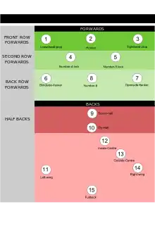 Each team starts the match with 15 players on the field and seven or eight substitutes.[47] Players in a team are divided into eight forwards (two more than in rugby league) and seven backs.[48]