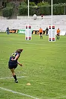 The full-back is normally positioned several metres behind the back line. They often field opposition kicks and are usually the last line of defence should an opponent break through the back line.[52] Two of the most important attributes of a good full-back are dependable catching skills and a good kicking game.[57]
