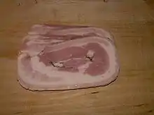 Rullepølse (Danish pronunciation: [ˈʁuləˌpʰølsə], rolled sausage) is a traditional Danish cold cut. A piece of pork belly—variants use beef flank or lamb—is flattened out and is spread with herbs and seasoning (salt, pepper, allspice), chopped onions, and in some variants, parsley. It is then rolled up and placed in a brine for a number of days, before being placed in a special press, cooled, and sliced thinly.[1][2] It is often use on rugbrød to make the traditional Danish open-faced sandwich, smørrebrød, usually garnished with a thick slice of sky and rings of raw onion.[3]