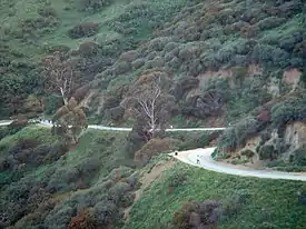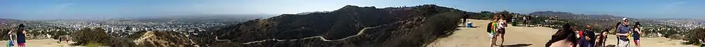 Runyon Canyon Park is a 160-acre (65 ha) park in Los Angeles, California, at the eastern end of the Santa Monica Mountains, managed by the Los Angeles Department of Recreation and Parks.[1] The southern entrance to the park is located at the north end of Fuller Avenue in Hollywood. The northern entrance is off the 7300 block of Mulholland Drive. The Runyon Canyon Road, a fire road that is closed to public motor vehicle access, runs roughly through the center of the park between the northern and southern entrances along Runyon Canyon itself, and there are numerous smaller hiking trails throughout the park.[2] The highest point in the park at an elevation of 1,320 ft (402 m) is known as Indian Rock. Because of its proximity to residential areas of Hollywood and the Hollywood Hills, celebrity sightings are common.[3] The park is also noted for having a fairly liberal dog policy, with dogs allowed off-leash in 90 of the park's 160 acres (0.65 km2).[3][4]