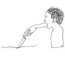 Sparse line drawings accompany her poems.[11][80] They have been compared to outsider art; her drawings and poetry have seen allusions to childhood artistry.[81][82][83] The National Poetry Library noted that the art in Milk and Honey, functions like a graphic novel.[84] The style of drawing continues in The Sun and Her Flowers.[85] Her illustrations, juxtaposed with the poems, are "striking" and "often disturbing", with one, for example, linking self-harm with despair.[80][86] Images that appear in her work include twisting bodies, crawling flowers, and fingers forming the shapes of hearts. Kaur explained that her style is intended to be recognisable and evoke a brand, akin to Apple's.[80] She creates them following their respective poem being written.[46] Since its inception, Kaur's public image has been denoted as authentic and individual; spiritual and boldly feminist.[87]