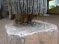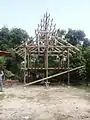 Typically, rural Khmer two-storey buildings, varying in size from 4 metres (13 ft) by 6 metres (20 ft) to about 6 by 10 metres (33 ft). The basic structure consists of a wooden frame, and the roof is erected before the walls on the upper floor are inserted. The roof frame defines the type of the house: a gabled roof (Phteah Rông Daol), a hipped roof (Phteah Pét), the Khmer house (Phteah Keung) with a roof shape sometimes called a bonnet roof or shikoro in Japanese. In Battambong province most houses have open spaces beneath the roof. They are called Phteah Rông Doeung, which may be derived from thbal kdoeung, meaning that a rice mill was stored at the back of the house under a second awning.[1] A common feature in every type of house is a 5–10 cm gap, on all four sides, between the top of the wall of the upper floor and the roof.