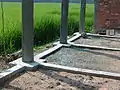 The load-bearing piles of the building stand on single foundations. To comply with the specific conditions of the generally loamy soils, single foundations are laid in the following manner: At the bottom of a 1 metre deep excavation several wooden poles of 1.5 – 2.00 metres length are rammed into the ground and then covered with a layer of compacted stone, followed by a hewn stone or prefabricated concrete slab, which provides the base for the pile. The excavation is then filled with soil. In a modern version the single foundations are linked with concrete slabs and prefabricated pillars extending to the upper floor are used.