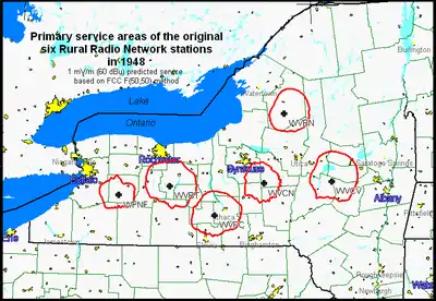 A primary objective was to provide satisfactory rural coverage throughout the "milkshed" of New York State extending from the Niagara Frontier to the Capital District, and north to the Saint Lawrence Valley. The network would be headquartered in Ithaca, near the geographical center of this region and home of the New York State College of Agriculture at Cornell University, the state's land grant institution.[6] With the help of engineering consultants Dr. Miller McClintock, Murray Crosby, and William S. Halstead (the latter two would later develop an FM stereo system), six hilltop transmitter sites, each over 610 m (2000 ft) AMSL[7] and spaced roughly 80 km (50 mi) apart across line-of-sight paths, were identified and acquired for the project. Based on 50 μV/m (34 dBμ) rural service contour predictions, these stations would have a combined coverage area encompassing 118,000 farms, 76 percent of the total farms in New York state at that time. Space for RRN's studios and offices was leased in the existing Ithaca Savings Bank building[8] at 306 East State St. in downtown Ithaca, and General Electric, which then manufactured broadcast products at the Electronics Park plant in nearby Syracuse, was chosen as the prime equipment supplier. Applications for the six FM construction permits were filed with the FCC in mid-July 1947 and granted three months later.