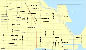 Rush Street is a one-way street in the Near North Side community area of Chicago in Cook County, Illinois, United States. The street, which starts at the Chicago River between Wabash and North Michigan Avenues, runs directly north until it slants on a diagonal as it crosses Chicago Avenue then it continues to Cedar and State Streets, making it slightly less than a mile long.[1] One lane also runs southbound from Ohio Street (600N) to Kinzie Street (400N) as part of a two-way street segment. It runs parallel to and one block west of the Magnificent Mile on the two-way traffic North Michigan Avenue, which runs at 100 east up to 950 north.[2] The street, which is also one block east of the one-way southbound Wabash Avenue, formerly ran slightly further south to the Chicago River where over time various bridges connected it to the Loop, Chicago's central business district.