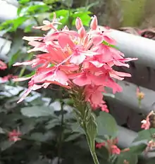 A genus of shrubby herbs or shrubs.[2][3][4] The leaves are arranged opposite,[3][5] they have visible linear cystoliths.[2] The flowers are in spikes or panicles,[3] or in 3-7-flowered,[5] cymules aggregated into long raceme-like cymes.[2] The flower has bracts and bracteoles (small bracts) that are narrow and inconspicuous.[3] The flower calyx is deeply 5-lobed,[2][3][4] with narrow,[3] or linear-lanceolate or filiform (thread-like) shaped lobes.[2] Sometimes with thread-like tips.[3] The corolla-tube is narrowly cylindrical,[3] and long and linear.[2][4] it is divided into 5 subequal lobes,[3] which are spreading or reflexed.[2] The corolla (petals of the flower) are usually red, but may be salmon-pink, scarlet or orange-red. They are also hairy and sometimes glandular, on the outside.[2] It has 2 stamens which are just exserted (projected beyond the corolla-tube).[2][3] They have anthers which are 1-celled. The ovary is 2-celled with 2 ovules in each cell or loculus.[2][3] Meaning it has 2-4-seeds. It has a filiform (thread-like) shaped style.[3] The fruit or seed capsule is club-shaped,[3] with solid stalk-like basal part.[2] Inside the capsule, the seeds are smooth and glabrous or variously ornamented.[3] They are situated on prominent hook-shaped retinaculas (thick fibres), without hygroscopic hairs.[2]