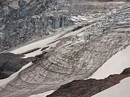The Russell Glacier is a medium-sized glacier on the north flank of Mount Rainier, Washington. Named for the geologist Israel Russell,[2] it covers 1.3 square miles (3.4 km2) and contains 3.1 billion ft3 (88 million m3) of ice.[1] Starting from its highest point at 9,400 feet (2,900 m), the Russell Glacier flows northeast towards the Carbon Glacier and contributes ice to the larger glacier before becoming distinct below 7,000 feet (2,100 m).[3] With most of the ice located from 8,000 feet (2,400 m) to 9,000 feet (2,700 m), the glacier only descends to 6,800 feet (2,100 m), unlike the much lower extent of the Carbon Glacier.[3] Echo Rock and 8,364 ft (2,549 m) Observation Rock, two minor sub-peaks of Rainier, lie northwest of this glacier. Meltwater from the glacier eventually reaches the Carbon River.[1]