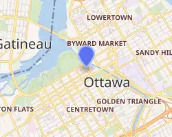 The Second Empire hotel was located at the southeast corner of Sparks Street and Elgin Street.[1] A small hotel was first built there in the 1840s and was named Campbell's Hotel after its proprietor. In 1863, it came under the ownership of James Gouin, who named it the Russell House after a family in the United States he managed a hotel for, in Quebec City. Gouin later built the Caledonia Springs Hotel, a famous spa in eastern Ontario, and was appointed Ottawa Postmaster by Sir John A. Macdonald.[2]