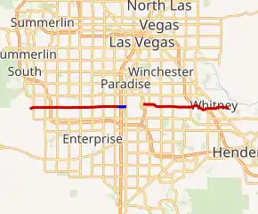 Russell Road is a section line road within the Las Vegas Valley of Clark County, Nevada. It is no longer a continuous road through the valley, as McCarran International Airport interrupts its right of way. The eastern section terminates at the eastern edge of the airport, with the road resuming at Las Vegas Boulevard on the western edge of the airport. The intersection of Russell Road and Las Vegas Boulevard is often considered to mark the southern terminus of the Las Vegas Strip.[2]
