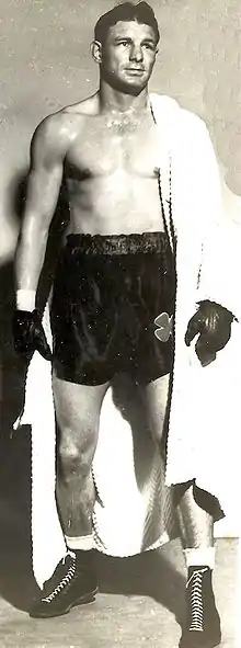 Russell Scott was born on March 27, 1917 in Electra, Texas. He was 5 feet, 11 inches tall and weighed 180 lbs. His boxing record is won 114 (KO 61) + lost 31 (KO 6) and drawn 6 = 151 rounds boxed 1112 KO% 40.4. Russell Scott is the younger brother of lightweight boxer Howard Scott. Most of Russell Scott's losses were at the end of his career. His death came on January 20, 1980 about 28 years after he retired from boxing. He was married three times, first to Geraldine Nichols, and then to Helen Green and last to Betty Brown. Russell had three daughters and one son. He went to George Washington University on an American football scholarship.