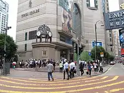 Russell Street used to be a traditional Chinese wet market where hawkers sold vegetables, fruits, meats and groceries. Dai pai dong (cooked-food stores) could also be found along the street. Due to the lack of hygiene and sanitation knowledge at that time, mice infestation was very serious in there—people even called Russell Street the "Mouse Street".[6] The Jian family, in 1905, founded The Nanyang Brothers' Tobacco Co., based in Russell Street. Due to the intense rivalry with the monopoly, British American Tobacco company, the Jian family declared bankruptcy and closed the factory in 1908.[7] In the 1920s, Hong Kong Tramways built a tram depot by Russell Street, mainly for tram repair and parking. As the demand for tram service grew, the old Russell Street tram depot could no longer park all the trams Hong Kong Tramways owned. The company decided to expand the Russell Street depot, and at the same time built a temporary tram depot in North Point to ease tram parking problem. In 1951, Hong Kong Tramways finished the renovation of Russell Street depot, renamed it as Sharp Street depot. The North Point temporary tram depot was then closed.[8] Not long after the expansion of the Russell Street tram depot, the Tramway workers resented Hong Kong Tramways for unjustifiable dismissal and break of employment contract, which eventually caused a labour dispute in 1952. In 1989, Lockhart Road market reconstruction completed. Hawkers and Dai Pai Dong on Russell Street all moved into the new Lockhart Road market. The Sharp Street depot (formerly Russell Street depot) was shut down and demolished. All trams were moved to Sai Wan Ho and Whitty Street depot. The site of Russell Street was then reconstructed into Times Square.