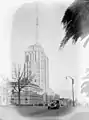The main impressive New York skyscraper style tower, recognised as a symbol of the police in Victoria,[4] was designed by Public Works Chief Architect Percy Edgar Everett and constructed 1940–43.[5] The 1940s construction also included lower wings on the corner of Russell Street and Latrobe Street, incorporating the Police Theatrette / Ballroom, while an 1889 wing on Mackenzie Street remained of the earlier police buildings, and in 1970 a large brown brick building was added behind the tower.