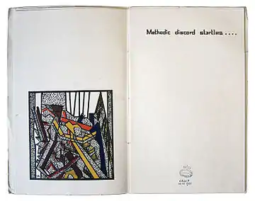 Russian Ballet is an artist's book by the English artist David Bomberg published in 1919. The work describes the impact of seeing a performance of Diaghilev's Ballets Russes, and is based on a series of drawings Bomberg had done around 1914,[1] while associated with the Vorticist group of avant-garde artists in London. Centred on Wyndham Lewis and Ezra Pound, the movement flourished briefly 1914–1915, before being dispersed by the impact of the First World War. The only surviving example of a vorticist artist's book, the work can be seen as a parody of Marinetti's seminal futurist book Zang Tumb Tumb, using similar language to the Italian's work glorifying war (for example, the phrase "Methodic discord startles ..."[2]), but instead praising the impact of watching the decidedly less macho Ballets Russes in full flow.