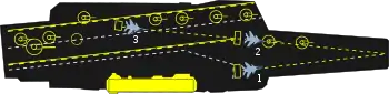 On 15 November 2016, Admiral Kuznetsov, took part in "a large-scale operation against the positions of terrorist groups Islamic State and Al-Nusra, in the provinces of Idlib and Homs" in Syria by launching Su-33 fighter strikes. This was the first time the Russian aircraft carrier would take part in combat operations.[65] The Russian Defence Ministry later reported that at least 30 militants had been killed as a result of those strikes, including three field commanders, among them Abul Baha al-Asfari, leader of Al-Nusra reserves in the provinces of Homs and Aleppo. Al-Asfari had also planned and led several insurgent attacks on the city of Aleppo itself. The Su-33s reportedly used 500 kg (1,100 lb) precision bombs.[66] On 3 December 2016, an Su-33 crashed into the sea after attempting to land on the carrier. The plane crashed on its second attempt to land on the aircraft carrier in good weather conditions. The pilot was safely recovered by a search and rescue helicopter.[67] Initially it was suspected that the plane missed the wires and failed to go around, falling short of the bow of the warship, but later it was revealed that the arresting cable failed to hold the aircraft, and was damaged in the attempt. Following the two incidents, the air wing was transferred to shore at Khmeimim Air Base near Latakia, Syria to continue military operations while the carrier's arresting gear issues were addressed.[68]