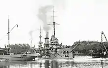 Imperatritsa Mariya, named after Tsarina Maria Feodorovna,[6] mother of Tsar Nicholas II, was built by the Russud Shipyard at Nikolayev, Russian Empire. She was laid down on 30 October 1911 along with her sister ships Imperator Aleksander III and Imperatritsa Ekaterina Velikaya, but this was merely a ceremonial event as the design had not yet been finalized nor the contract signed. She was launched on 19 October 1913 and arrived in Sevastopol on 13 July 1915, where she completed her fitting out during the next few months and conducted sea trials. On 1 October she provided cover for the Black Sea Fleet's pre-dreadnoughts as they bombarded targets in Kozlu, Zonguldak and Karadeniz Ereğli. She did much the same when older battleships bombarded targets in Bulgaria on 20–22 October and then Varna itself on 27 October. The light cruiser Midilli narrowly escaped a running engagement with the Imperatritsa Mariya on 4 April 1916 as the battleship narrowly missed her several times before she could disengage. Three months later both Imperatritsa Mariya and Imperatritsa Ekaterina Velikaya, alerted by intercepted radio transmissions, sortied from Sevastopol in an attempt to intercept the ex-German battlecruiser Yavuz as she returned from a bombardment of the Russian port of Tuapse on 4 July. The Yavuz dodged north and avoided the Russians by paralleling the Bulgarian coastline back to the Bosphorus. The Midilli mined the harbor of Novorossiysk on 21 July, but the Russians, again alerted by radio intercepts, attempted to catch her on her return journey. Midilli was lured into range of Imperatritsa Mariya's guns the next day when the cruiser pursued the Russian destroyer Schastlivy, but she managed to escape with only splinter damage.[7]