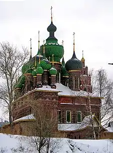 | Combinations of onion domes and tent-roofs | An archaizing four-piered church on an elevated base with five outsize onion domes is surrounded by an enclosed gallery leading to several chapels, porches, and belfries of various shapes and sizes. | Yaroslavl and Upper Volga region, 1640s to 1680s | ![]() | |