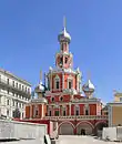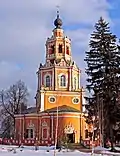 A cuboid, usually five-domed church with no piers and a pyramid of kokoshniki is connected by a covered gallery (refectory or vestibule) to a tent-like bell tower (the prow) over the western porch. | Moscow, from 1650s onward | ![]() | |