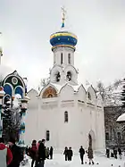 Russian churches often have various recurrent elements in their architecture. The onion dome is for example a recurrent and important element in the architecture of Russian churches. Often Russian churches have also multi-colored filigree ornamental elements. Furthermore the colour white plays an important role in the style of Russian churches. In the past, Russian churches were made out of wood.[1][2][3] Many Russian Orthodox churches are distinguished by their verticality, bright colors and multiple domes, which provide a striking contrast with the flat Russian landscape, often covered in snow. The very first churches in Kievan Rus', such as the 13-domed wooden Cathedral of St. Sophia, Novgorod, differed in this regard from their mainly single-dome Byzantine predecessors. The number of domes was important symbolically. One dome symbolized the single God; three represented the Trinity, and five represented Christ and his four evangelists.[4] At first the baptistery, narthex, and choir gallery above the narthex were a common feature of Rus' churches, but gradually they disappeared. After a century of Byzantine imitations, the Russian masons began to emphasise the verticality in church design.