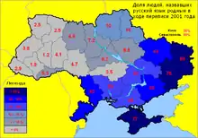 Russification policy was more intense in Ukraine than in other parts of the Soviet Union, and the country now contains the largest group of Russian speakers who are not ethnically Russian: as of 2009, there were about 5.5 million Ukrainians whose first language was Russian. Russian speakers are more prevalent in the southeastern half of the country, while both Ukrainian and Russian are used equally in the center, and Ukrainian dominates in the west.[12] Some of these "russified Ukrainians" speak Russian, while others speak a mix of Ukrainian and Russian known as "surzhyk"; many do have some proficiency in Ukrainian. Estimates of their prevalence in the country vary, but according to different studies, "russified Ukrainians" comprise a third to a half of the total population of Ukraine.[13]