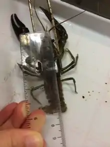 Adult rusty crayfish can reach 10 centimeters (4 inches) in length, although they reach maturity at about 4.4 cm (1.7 in),[10] and can range in color from greenish grey, to reddish brown,[11][12][13] They can be easily recognized by two "rusty", reddish colored spots on the sides of their back and their large front claws with black bands around the tips.[14] Male rusty crayfish have small hook-like features on their first pair of hind legs that they use to hold onto a female while mating.[6]