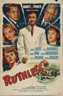 Ruthless is a 1948 American drama film directed by Edgar G. Ulmer starring Zachary Scott, Sydney Greenstreet and Louis Hayward.[1]