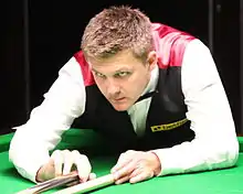 Day lost in qualifying for the opening ranking event of the 2012–13 season the Wuxi Classic 0–5 to Robert Milkins.[11] He was then beaten in the second round of the Australian Goldfields Open and the Shanghai Masters, 3–5 to Matthew Selt and 0–5 to John Higgins respectively.[11] Day was defeated 3–6 by Neil Robertson in the opening round of the International Championship, but then came perhaps the best result of his season at the UK Championship.[11] He beat Ding Junhui 6–4 in a high quality first round encounter,[12] before letting a 3–0 lead against world number two Mark Selby slip to lose 4–6.[13] Day played in nine of the ten minor-ranking Players Tour Championship events during the season with his best results being two quarter-final defeats to be ranked 32nd on the Order of Merit, just outside the top 26 who qualified for the Finals.[14] Day struggled in the second half of the season as he failed to qualify for four of the remaining five ranking events, losing 2–5 in the first round of the World Open to Mark Allen in the one he did reach.[11] He failed to qualify for the World Championship for the first time since 2006, narrowly losing to Ben Woollaston 9–10 in the fourth and final qualifying round. He finished the season ranked world number 31.[15]