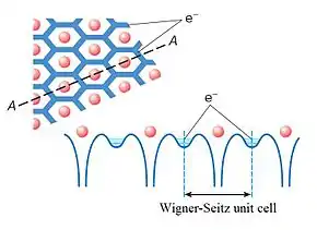 Rydberg matter consists of usually[17] hexagonal[18][16] planar[19] clusters; these cannot be very big because of the retardation effect caused by the finite velocity of the speed of light.[19] Hence, they are not gases or plasmas; nor are they solids or liquids; they are most similar to dusty plasmas with small clusters in a gas. Though Rydberg matter can be studied in the laboratory by laser probing,[20] the largest cluster reported consists of only 91 atoms,[7] but it has been shown to be behind extended clouds in space[10][21] and the upper atmosphere of planets.[22] Bonding in Rydberg matter is caused by delocalisation of the high-energy electrons to form an overall lower energy state.[3] The way in which the electrons delocalise is to form standing waves on loops surrounding nuclei, creating quantised angular momentum and the defining characteristics of Rydberg matter. It is a generalised metal by way of the quantum numbers influencing loop size but restricted by the bonding requirement for strong electron correlation;[19] it shows exchange-correlation properties similar to covalent bonding.[23] Electronic excitation and vibrational motion of these bonds can be studied by Raman spectroscopy.[24]