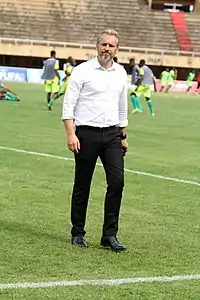 In December 2017, prior to the 2018 African Nations Championship competition, he signed a multiple-year contract with the Federation of Uganda Football Associations to manage the Uganda national team at a gross monthly salary of $25,000.[6][7][8] He replaced Milutin Sredojević, who left in July 2017 to become coach of the Orlando Pirates.[4] On 17 November 2018, the Cranes qualified for the 2019 African Cup of Nations after defeating Cape Verde.[9] In November 2018, the Uganda national team was nominated with five others for the CAF Men's national team of the year award 2018.[10]