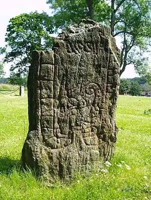 The damaged inscription on Sö 239, which is missing its upper section, is 1.4 meters in height and consists of runic text in the younger futhark that is carved on a serpent along the outer edge of the stone with a rider on a horse depicted in the center of the inscription. Several other Scandinavian runestones include depictions of horses, including DR 96 in Ålum, N 61 in Alstad, Sö 101 in Ramsundsberget, Sö 226 in Norra Stutby, Sö 327 in Göksten, U 375 in Vidbo, U 488 in Harg, U 599 in Hanunda, U 691 in Söderby, U 855 in Böksta, U 901 in Håmö, U 935 at the Uppsala Cathedral, and U 1003 in Frötuna.[1] The inscription is classified as being carved in runestone style Pr3, which is also known as Urnes style. This runestone style is characterized by slim and stylized animals that are interwoven into tight patterns, with the animal heads typically seen in profile with slender almond-shaped eyes and upwardly curled appendages on the noses and the necks. Based on stylistic analysis, Sö 239 has been attributed to a runemaster with the normalized name of Halvdan, who was active in the mid-11th century in Södermanland and signed the inscription Sö 270 in Tyresta. Over fifteen other runestones have been attributed to him, including Sö 235 in Västerby, Sö 237 in Fors, Sö 244 in Tuna, Sö 245 in Tungelsta, the now-lost Sö 247 in Ålsta, Sö 252 in Säby, Sö 256 in Älby, Sö 262 in Blista, Sö 269 in Söderby Malm, Sö 272 in Upp-Norrby, Sö 274 in Södersluss, Sö 290 in Farsta, Sö 292 in Bröta, Sö 297 in Uppinge, Sö 298 in Uringe Malm, and Sö 301 in Ågesta Bro. Sö 239 was noted in the early 1800s, and was found during an inspection in 1865 with the inscription side face-down.[2] The stone was erected in 1897 east of the entrance to the Häringe slott, a Swedish castle.[2]