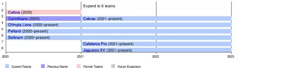 At the initial announcement, Brazil and Uruguay originally would have two team each, but instead one team each (Corinthians and Peñarol) will play in 2020 season, meaning it may be possible for the two countries to expand in the future (Club Nacional de Football was hinted as a possibility in Uruguay) [4] besides a possible Mexican team or a second Chilean team.[14][15] With the possible change of Super Rugby to a Trans-Tasman (Australasian) competition, Argentina could add a second team, the Jaguares, based in Buenos Aires, in 2021.[16][17][10] In November 2020, another new team proposed for 2021 with official expression of interest by Sudamérica Rugby for the inclusion of a second Argentine Buenos Aires based team in the 2021 SLAR,[18] but a second Argentine team won't play in 2021 and most Argentine players will depart the team either overseas, or enter the draft for the 2021 Súper Liga Americana de Rugby season.[19] In August and September 2021 it was rumoured that a second Argentine franchise could join the competition in the future, based in Tucumán, but this possible expansion was postponed to the 2023 season.[20][21]