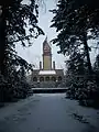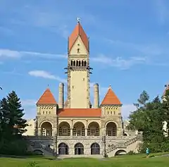 Visitors to the nearby Völkerschlachtdenkmal notice at first the chapel with its 60 meter high bell tower, which was opened in 1910. The Neo-Romanesque building ensemble, was built on a filled-up plateau and under the direction of Leipzig's building director Otto Wilhelm Scharenberg. It had the Romanesque Maria Laach Abbey in the Eifel region as a model and is the largest cemetery monument in Germany. The symmetrical complex of chapel facilities, crematorium and columbarium blends inconspicuously into the overall picture and is justified to the main north–south axis of the cemetery. Until 1924 the cemetery was enlarged to 63 hectares. During World War II the most recent cemetery extension was made to the present area of 82 hectares. They buried the 3474 victims of the World War II bombing of Leipzig in today's XXVIII. Division.