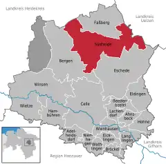 Südheide is a municipality in the district of Celle, in Lower Saxony, Germany. It takes its name from the heathland Südheide. It was formed on 1 January 2015 by the merger of the former municipalities Hermannsburg and Unterlüß.