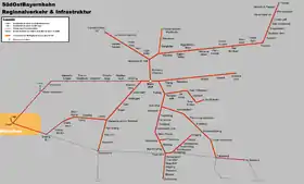 Südostbayernbahn (Southeast Bavaria Railway) is one of several regional railway networks in Germany owned by Germany's national railway, Deutsche Bahn AG (DB AG). Since 2001, the network has included the railway hub of Mühldorf which connects 7 major railway lines from Munich, Rosenheim, Freilassing, Burghausen, Simbach am Inn, Passau and Landshut, forming a star-shaped network of lines called Linienstern Mühldorf ("Mühldorf route star network").[1] SüdostBayernBahn is subordinated to DB RegioNetz Verkehr and DB RegioNetz Infrastruktur.