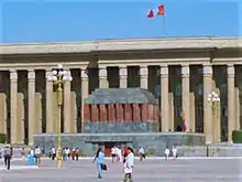 Sükhbaatar's Mausoleum (Mongolian: Сүхбаатарын бунхан) was a mausoleum for Damdin Sükhbaatar, leader of the Mongolian Revolution of 1921, and Khorloogiin Choibalsan, leader of the Mongolian People's Republic from the late 1930s to his death in 1952, in Mongolia's capital Ulaanbaatar, on the northern side of Sükhbaatar Square in front of the Saaral Ordon.[1] The building was erected after Choibalsan's death, and removed in 2005 to make place for a hall dedicated to Genghis Khan. The mausoleum resembled the shape of Lenin's Mausoleum but differed in color.[2] The mausoleum has never been opened for public visits.