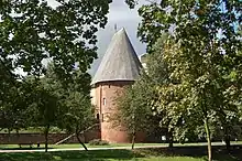 The Griffin dukes lost the area to the Samborides during the following years, and the next surviving documents mentioning the area concern donations made by Samboride Swietopelk II, dating to 1236 (two documents) and 1240.[9] In the earlier of the two 1236 documents, a Johann "castellanus de Slupcz" is mentioned as a witness,[10] Schmidt considers this to be the earliest mention of the gard, since a castellany required the existence of a gard.[11] The first surviving record explicitly mentioning the gard is from 1269: it notes a "Christianus, castellanus in castro Stolpis, et Hermannus, capellanus in civitate ante castrum predictum", thus confirming the existence of a fortress ("castrum") with a suburbium ("civitas").[11] Schmidt further says that the office of a capellanus required a church, which he identifies as Saint Peter's.[11] This church is mentioned by name for the first time in a 1281 document of Samboride Mestwin II, which also mentions Saint Nicolai church and a Saint Mary's chapel in the fortress.[12] The oldest mention of Saint Nicolai church dates to 1276.[12]