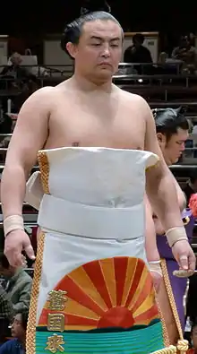 Sōkokurai Eikichi (蒼国来栄吉, born 9 January 1984 as Enkhtuvshin (Chinese: 恩和图布新, Mongolian: Энхтүвшин)) is a former professional sumo wrestler from Inner Mongolia, China. He was the only Chinese national to reach the top makuuchi division. Sōkokurai is of Mongolian descent. He made his professional debut in 2003 and was promoted to the top division in September, 2010. In April 2011 he was ordered to retire by the Japan Sumo Association after being found guilty of involvement in match-fixing. Refusing to do so, he was dismissed. However, in March 2013 his dismissal was nullified by the Tokyo District Court. After the Sumo Association decided not to appeal the decision, he reappeared on the banzuke in July 2013 at the Nagoya Basho, ranked as a maegashira 15, the rank he was at when he was expelled.[1] His highest rank of maegashira 2 was achieved in March 2017. He won one special prize for Technique and one gold star for beating a yokozuna. In 2019 he acquired Japanese citizenship and he retired after the March 2020 tournament to take over Arashio stable.