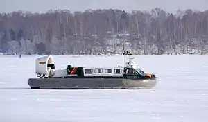 The SAH 2200 is a compact military hovercraft. It has the capacity to transport a maximum of 12 fully-equipped troops, 23 passengers, or alternatively a payload of up to 2.2 tons.[1] The vehicle is typically armed with a single 12.7mm machine gun. Both propulsion and auxiliary power is supplied by a single Cummins 6CTA-8-3M-1 diesel engine, rated at 190bhp at 2,500rpm.[1] Power from the engine is delivered via a toothed belt to the vehicle's single 1.5m diameter propeller, which is positioned within a duct above the after part of the deck. Dependent upon customer preference, the deck area can be left completely open, covered by a half-canopy, or placed entirely within a cabin.[1]