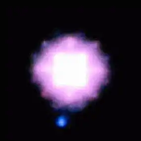 Three-colour image of SCR1845−6357AB generated from the SDI filter images (blue=1.575 μm, green=1.600 μm, red=1.625 μm). Because the T-dwarf fades away towards the longer wavelengths, it appears quite blue in this image. It is roughly 50 times fainter than the star and is separated from it by an angle of 1.17 on the sky (4.5 times the Earth-Sun distance).