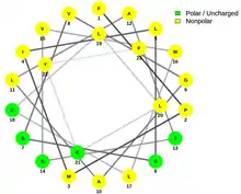 Based on results by Ali2D, the secondary structure of SLC46A3 is rich in α-helices with random coils in between.[42] More precisely, the protein is predicted to be composed of 62.9% α-helix, 33.8% random coil, and 3.3% extended strand. The regions of α-helices span the majority of the transmembrane domains. The signal peptide is also predicted to form an α-helix, most likely in the h-region.[43] The amphipathic α-helices possess a particular orientation with charged/polar and nonpolar residues on opposite sides of the helix mainly due to the hydrophobic effect.[44]