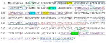 The protein sequence contains mixed, positive, and negative charge clusters, one of each, which are high in glutamine (Glu).[33] The clusters are located outside the transmembrane regions, and thus are solvent-exposed. Two 0 runs that run through several transmembrane domains in addition to a +/* run in between two transmembrane domains are also present. The protein contains a C-(X)2-C motif (CLLC), which is mostly present in metal-binding proteins and oxidoreductases.[36] A sorting-signal sequence motif, YXXphi, is also found at Tyr246 - Phe249 (YMLF) and Tyr446 - Leu449 (YELL).[37][38] This Y-based sorting signal directs the trafficking within the endosomal and the secretory pathways of integral membrane proteins by interacting with the mu subunits of the adaptor protein (AP) complex.[39] The signal-transducing adaptor protein 1 (STAP1) Src homology 2 (SH2) domain binding motif at Tyr446 - Ile450 (YELLI) is a phosphotyrosine (pTyr) pocket that serves as a docking site for the SH2 domain, which is central to tyrosine kinase signaling.[37][40] Multiple periodicities typical of an α-helix (periods of 3.6 residues in the hydrophobicity) encompass transmembrane domains.[41] 3 tandem repeats with core block lengths of 3 aa (GNYT, VSTF, STFI) are observed throughout the sequence.[33]