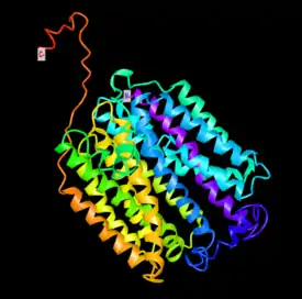 Solute carrier family 46 member 3 (SLC46A3) is a protein that in humans is encoded by the SLC46A3 gene.[5] Also referred to as FKSG16, the protein belongs to the major facilitator superfamily (MFS) and SLC46A family.[6] Most commonly found in the plasma membrane and endoplasmic reticulum (ER), SLC46A3 is a multi-pass membrane protein with 11 α-helical transmembrane domains.[7][8] It is mainly involved in the transport of small molecules across the membrane through the substrate translocation pores featured in the MFS domain.[9][10] The protein is associated with breast and prostate cancer, hepatocellular carcinoma (HCC), papilloma, glioma, obesity, and SARS-CoV.[11][12][13][14][15][16] Based on the differential expression of SLC46A3 in antibody-drug conjugate (ADC)-resistant cells and certain cancer cells, current research is focused on the potential of SLC46A3 as a prognostic biomarker and therapeutic target for cancer.[17] While protein abundance is relatively low in humans, high expression has been detected particularly in the liver, small intestine, and kidney.[18][19]