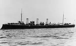 By the 1880s, the development of torpedoes and torpedo boats had produced a weapons system that could effectively challenge powerful ironclad warships. This led to the development in France of the Jeune École doctrine that emphasized the use of cheap torpedo boats and cruisers instead of expensive ironclads. As other navies, including Germany's, began to adopt the strategy, German planners saw the need for small warships capable of defending the fleet against attacking torpedo boats. The naval command called for a top speed of 19 knots (35 km/h; 22 mph), which would allow the vessel to also operate as a scout for the fleet. To keep weight limited, the armament was to consist of a pair of 10.5 cm (4.1 in) guns.[1][2] The ship proved to be a disappointment in service and she spent little time as a front-line combat unit.[3]