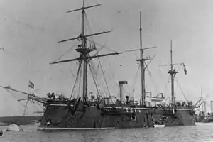 The government placed a low priority on naval activities, particularly in the 1870s; as a result, the shortage of funds precluded an active fleet policy. The ironclad fleet, including Kaiser Max, was kept out of service in Pola, laid up in reserve; the only vessels to see significant service in the 1870s were several screw frigates sent abroad.[4] In 1880, Kaiser Max had her sailing rig reduced.[1] Kaiser Max and an Austro-Hungarian squadron that included the ironclads Custoza, Tegetthoff, Don Juan d'Austria, and Prinz Eugen and the torpedo cruisers Panther and Leopard travelled to Barcelona, Spain, to take part in the opening ceremonies for the Barcelona Universal Exposition. This was the largest squadron of the Austro-Hungarian Navy that had operated outside the Adriatic.[5] In June and July 1889, Kaiser Max participated in fleet training exercises, which also included the ironclads Custoza, Erzherzog Albrecht, Tegetthoff, Prinz Eugen, and Don Juan d'Austria.[6]