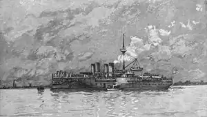 Sachsen was ordered by the Imperial Navy under the contract name "B," which denoted that the vessel was a new addition to the fleet. She was built at the AG Vulcan shipyard in Stettin; her keel was laid down in 1875 under yard number 74.[2] The ship was launched on 21 July 1877,[7] and was commissioned into the German fleet on 20 October 1878.[3] She was the first large, armored warship built for the German navy that relied entirely on engines for propulsion.[5] After her commissioning, Sachsen joined the German fleet,[3] which was tasked primarily with coastal defense against France and Russia, who were presumed to be the most likely enemies in a continental war.[8] In the early 1880s, heightened tensions with Russia prompted the naval command developed more offensively-minded contingencies. These formed the basis for the annual summer fleet maneuvers, in which Sachsen took part.[9] In 1887, she was present for the ceremonies marking the beginning of construction of the Kaiser Wilhelm Canal, which was to link the Kiel with the North Sea.[10]