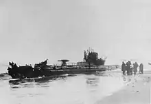 On 4 November 1916, U-20 grounded on the Danish coast south of Vrist, a little north of Thorsminde after suffering damage to its engines. Her crew attempted to destroy her with explosives the following day, succeeding, however, only in damaging the boat's bow (see picture) but making it effectively inoperative as a war ship.[4]